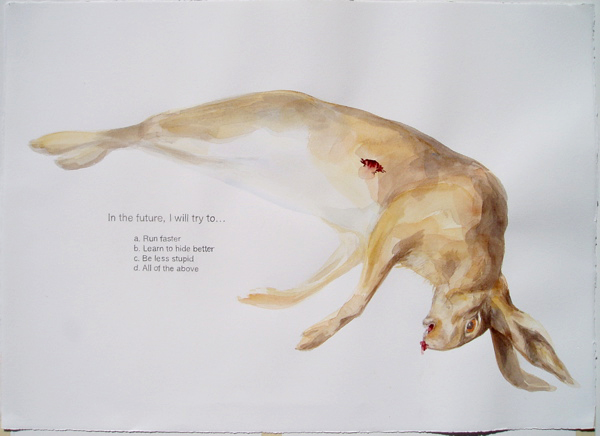 “Storytelling still plays a prominent role in her work. Critters try to break the spell of day to day heartbreak. Rabbits flee from hunters, girls are lost in the woods. Giant elk stumble over towns clasping bottles, is it a remedy they hold or just a beer?”